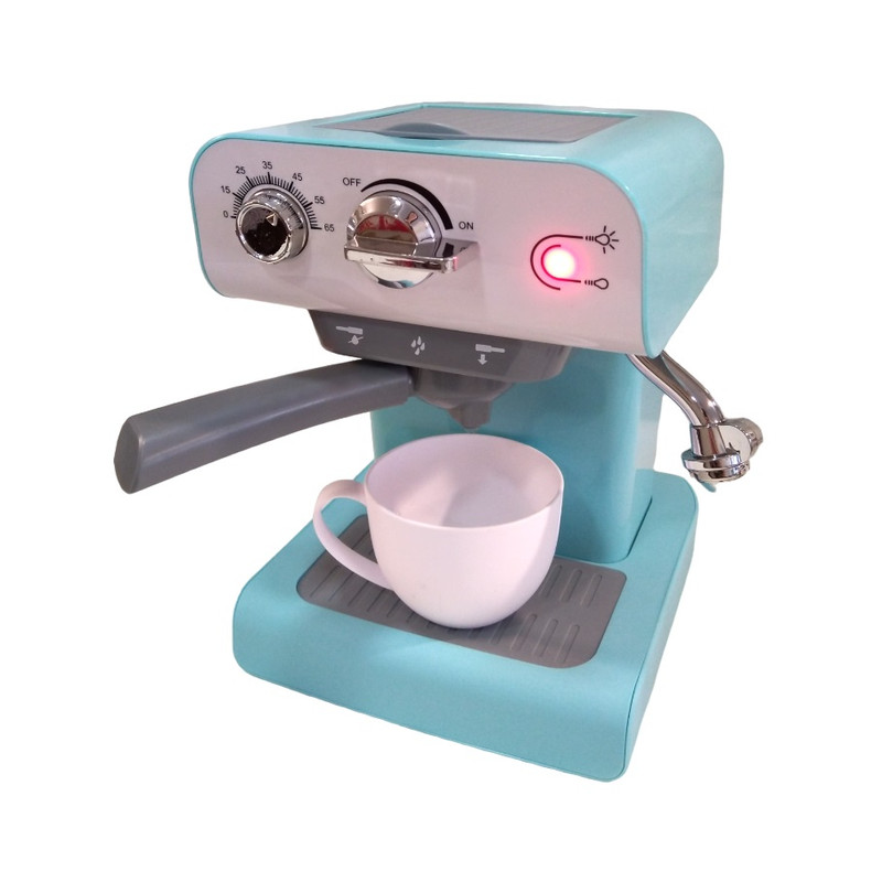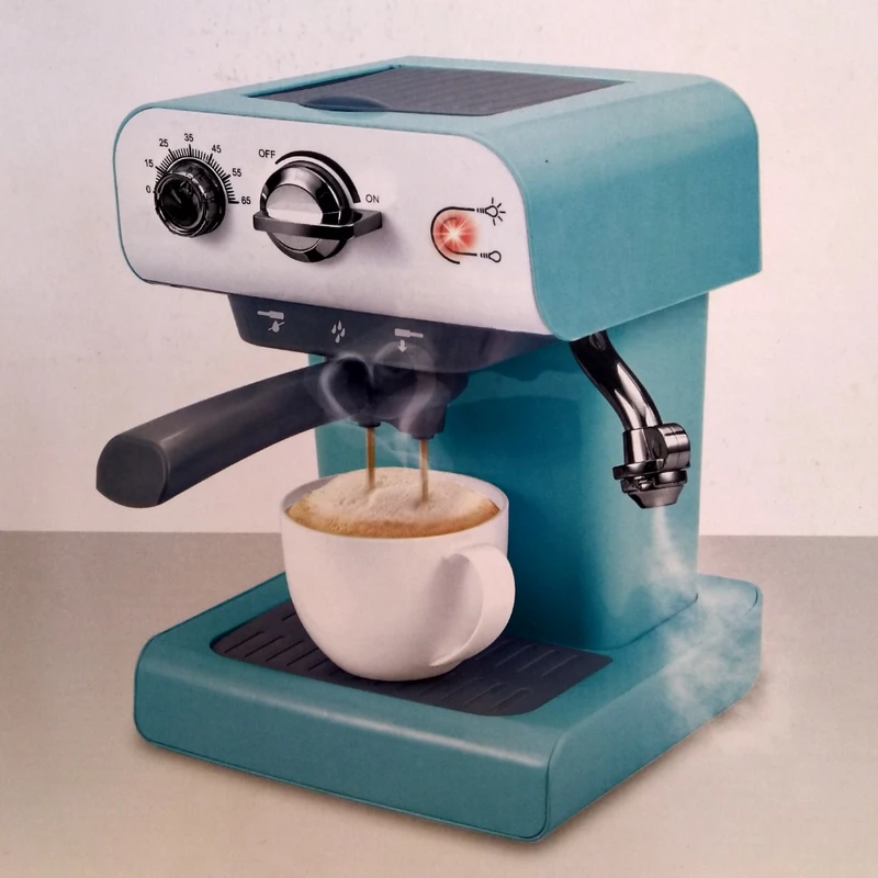 قهوه ساز به ارتفاع ۲۵ سانتیمتر . با چرخاندن کلید چراغ آن روشن شده و از لوله اسپرسو ساز بخار سرد خارج میشود . با چرخاندن دسته آب داخل فنجان میریزد . دارای جلوه صوتی .