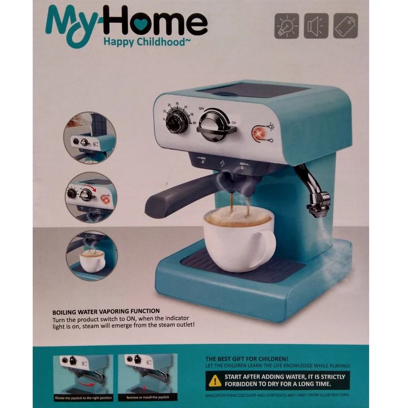 قهوه ساز به ارتفاع 25 سانتیمتر . با ریختن مقداری آب داخل دستگاه و چرخاندن کلید دستگاه شروع به کار میکند ، چراغ آن روشن شده و از لوله اسپرسو ساز بخار سرد خارج میشود . جلوه های صوتی جذاب در تمام مراحل این محصول را برای بچه ها بسیار جذابتر میکند . این اسباب بازی دارای کیفیت عالی و دوام بالا بوده و با بسته بندی شیک مناسب هدیه دادن میباشد .