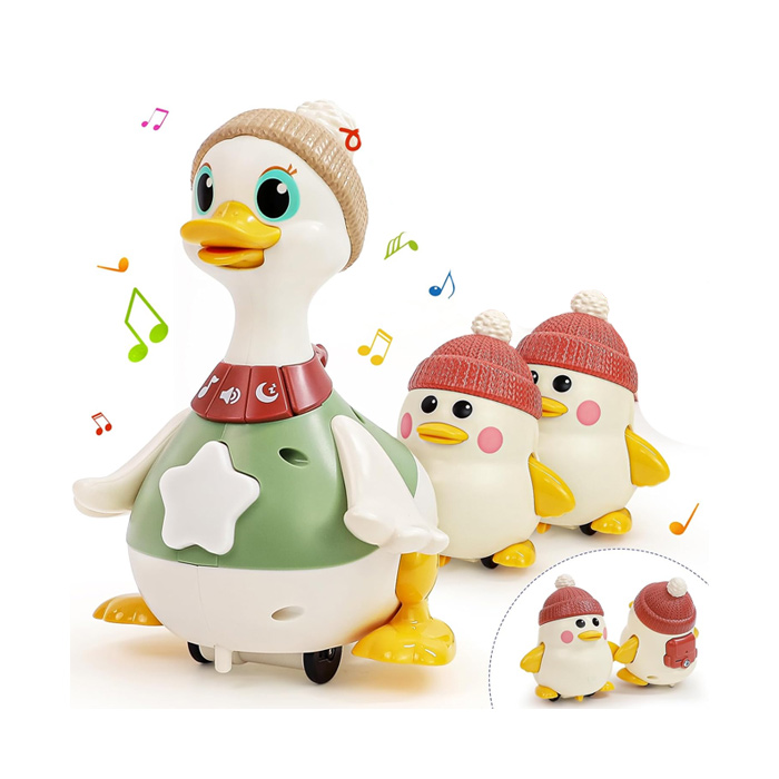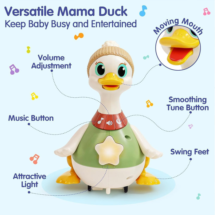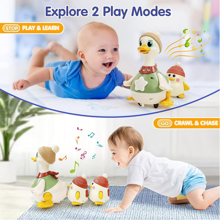در حالتی که اردک ایستاده باشد ، کودک در مقابل اسباب بازی می نشیند و با امکاناتی نظیر دکمه های موزیکال و رنگی آن بازی میکند