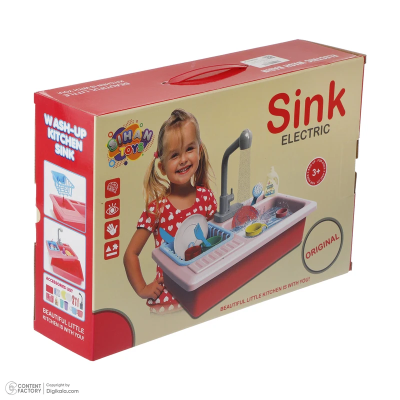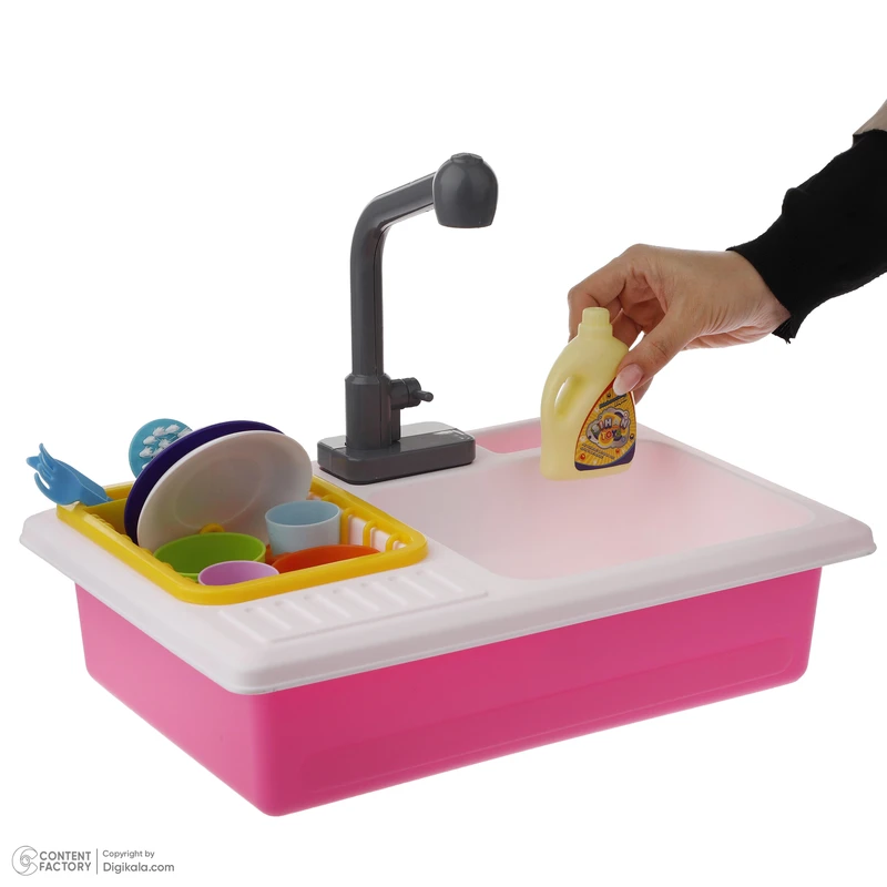 سینک ظرفشویی یک اسباب بازی مهیج و سرگرم کننده است که کودک با شستشوی ظروف و میوه ها حس خوبی را تجربه می کند. با ریختن آب داخل سینک و چرخاندن شیر آب، پمپ آب که توسط دو عدد باطری قلمی تغذیه می شود روشن شده و آب را از دهانه شیر آب سرازیر می کند و کودک می تواند با قرار دادن ظروف و میوهجات که داخل بسته بندی قرار دارد ، شروع به شستن آنها کند. این محصول یک هدیه جذاب و جدید برای کودکان شماست خرید این محصول را به شما پیشنهاد می کنیم